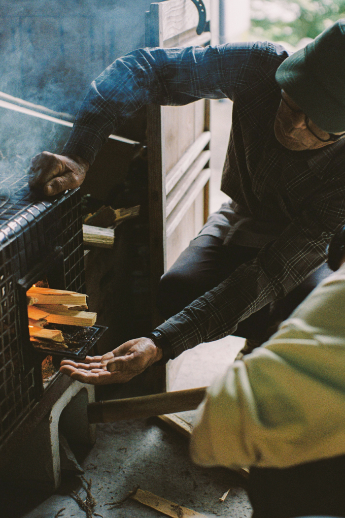 - ごんべえさんとかまどに火を点け、釜から湯気が上がるまで薪を小さく割りながらくべる体験
