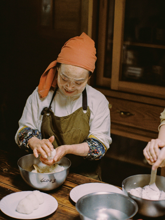 - 炊き上がったお米でおむすびを作り、法子さん手作りの郷土料理と共にいただく