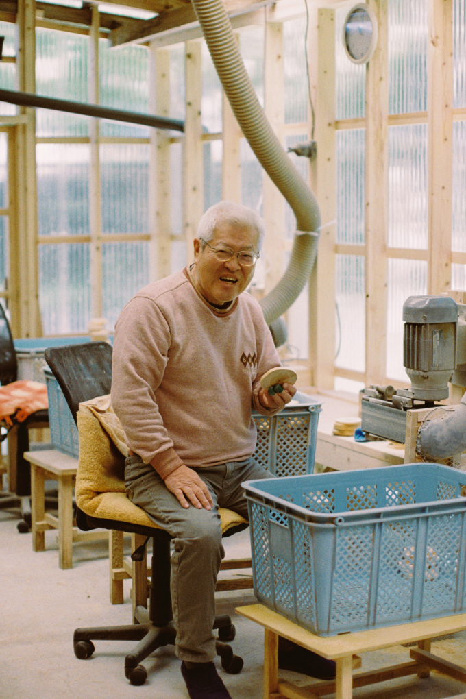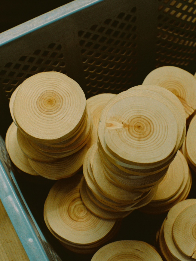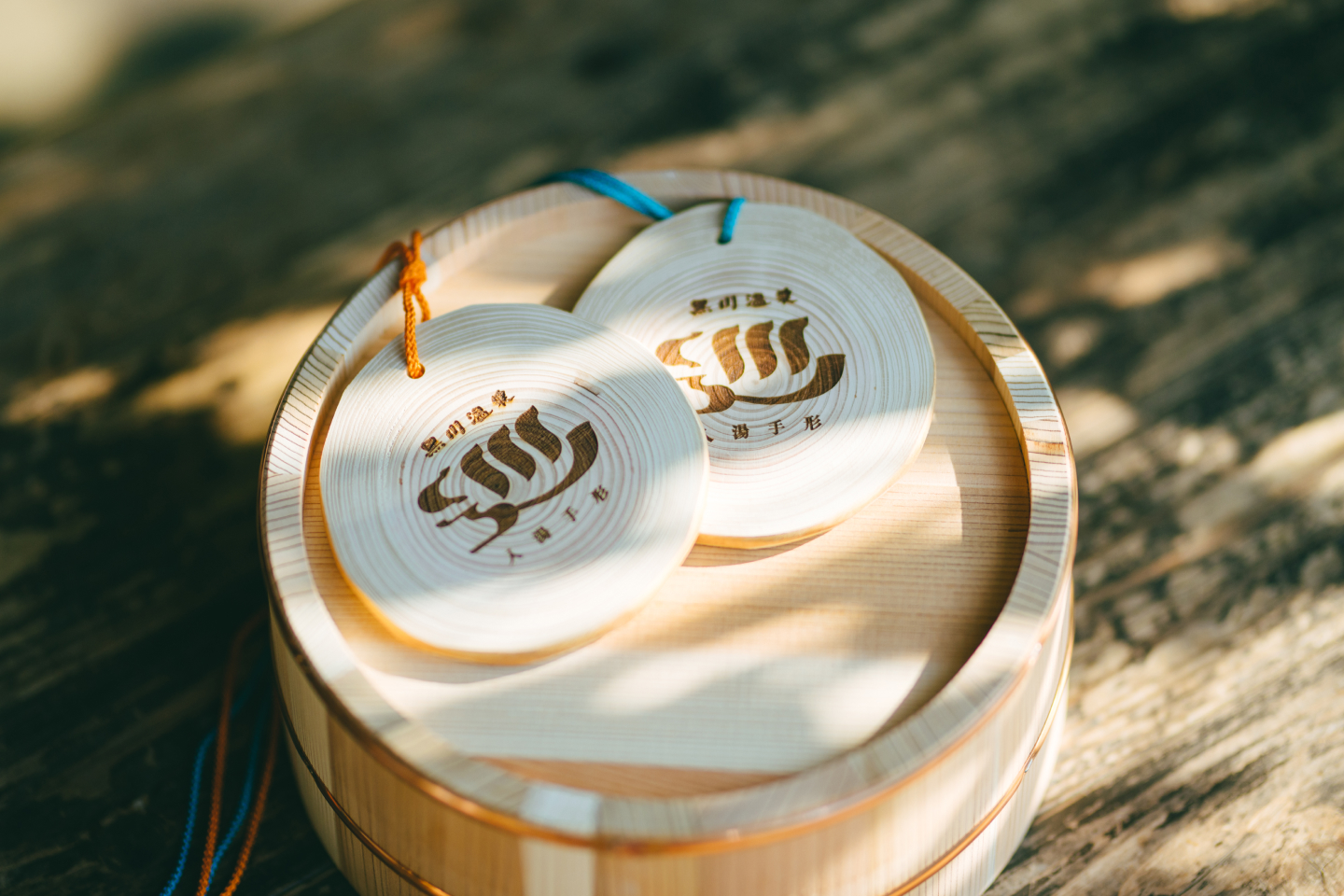 黒川温泉の「入湯手形」は、小国杉や檜など地域の間伐材からつくられています。その間伐材から手形ができるまでの工程を、地域に根ざした手形作り職人のガイドと一緒に森に入り、工房を訪ねて追体験するツアーです。自分の手形コースターをサンドペーパーで磨いたあと、コースターにデザインを自由に描き、レーザー焼印を施すと自分だけのオリジナル手形の完成です。
